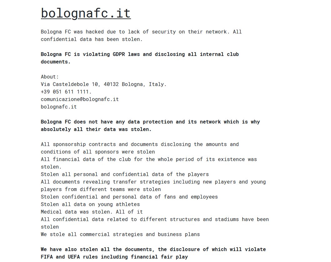 Nel comunicato, RansomHub non specifica le modalità di accesso ai sistemi informatici del Bologna FC, ma accusa il club di non avere adottato misure di sicurezza adeguate per la protezione dei dati e della rete, e di aver quindi violato il GDPR. Quest'ultima accusa assume rilievo considerevole, visto che la normativa europea comporta pesanti sanzioni per chi non tutela correttamente i dati personali. Sul sito, i criminali informatici elencano i dati sottratti: contratti di sponsorizzazione, informazioni finanziarie del club, documenti personali dei giocatori e dei tifosi, strategie di trasferimento, dettagli sui giovani atleti, dati medici e strategie commerciali. Viene inoltre fornito un link al database delle informazioni rubate, accessibile solo per la navigazione tra le cartelle, accompagnato da screenshot di documenti specifici come i dati sugli abbonamenti, contratti dei giocatori e sponsorizzazioni, inclusa una scansione del passaporto e l'IBAN dell'allenatore Vincenzo Italiano. L'ultimatum per la consegna del riscatto scade il 29 novembre alle ore 13:00, momento in cui si potrà comprendere l'esito finale di questo preoccupante episodio di cyber criminalità.