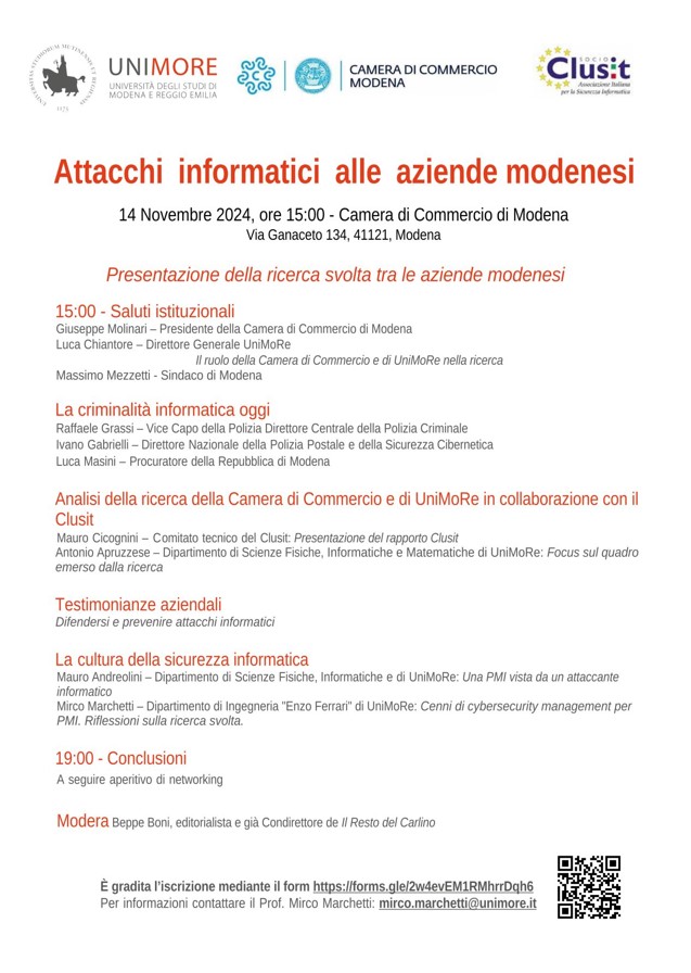 Mauro Cicognini del Clusit e Antonio Apruzzese, docente presso il Dipartimento di Scienze Fisiche, Informatiche e Matematiche, presenteranno i risultati di una ricerca condotta in collaborazione con la Camera di Commercio di Modena e il Clusit. L'indagine, che ha coinvolto oltre 500 aziende della provincia, ha rivelato la frequenza degli attacchi informatici e le problematiche tecniche e organizzative che le imprese devono affrontare. I dati evidenziano il ruolo cruciale delle grandi aziende, che fungono da propulsori per la sicurezza di intere filiere produttive.